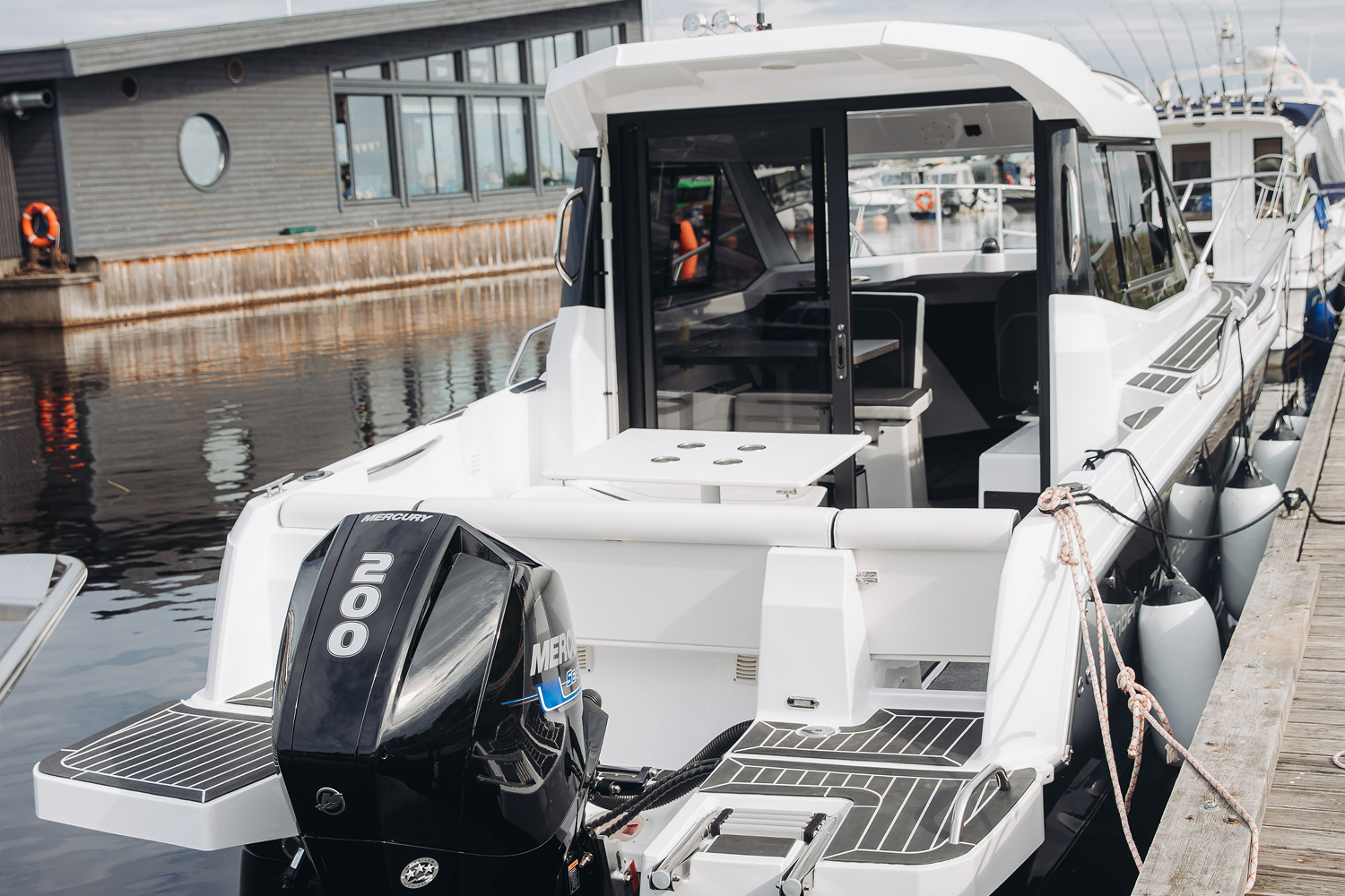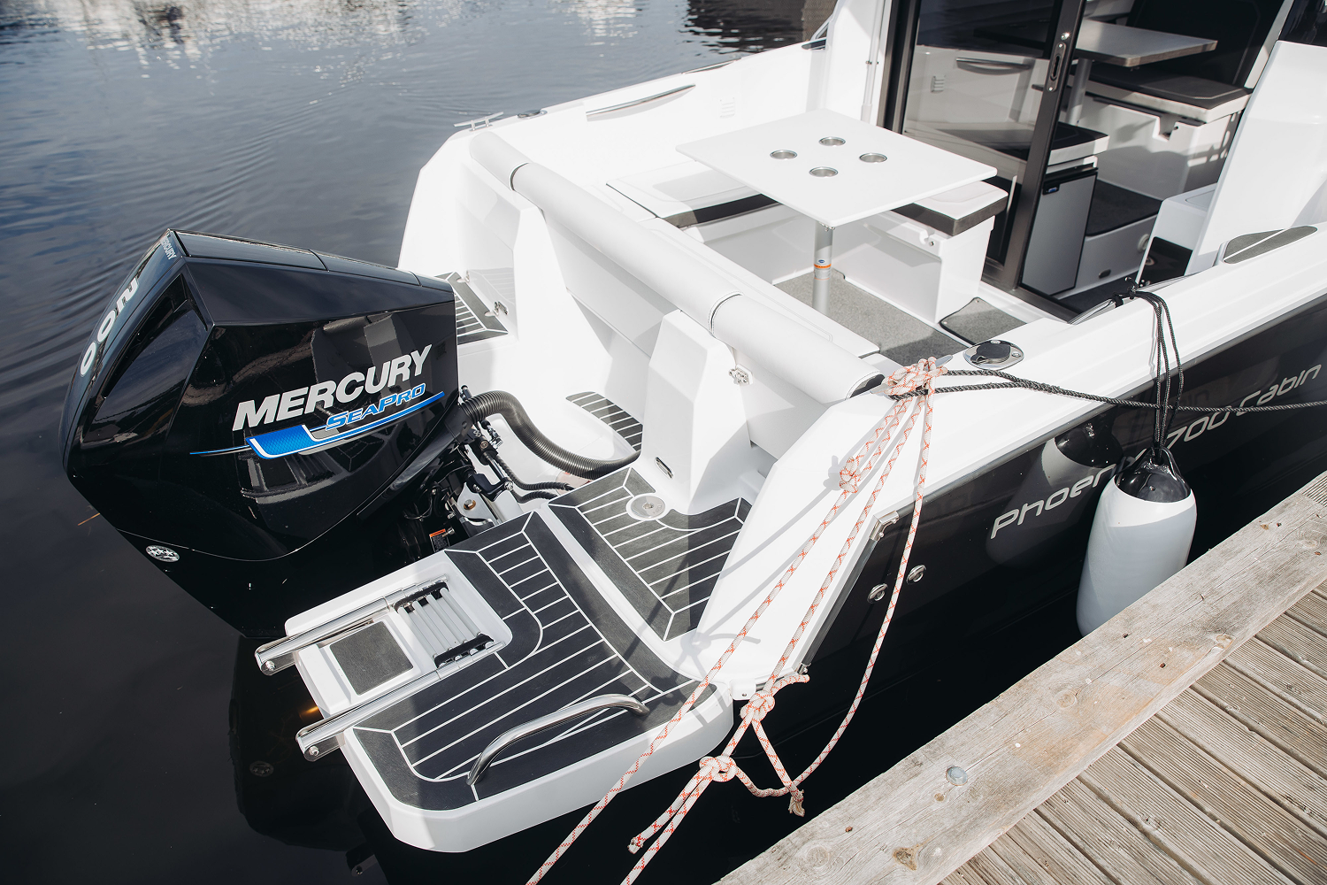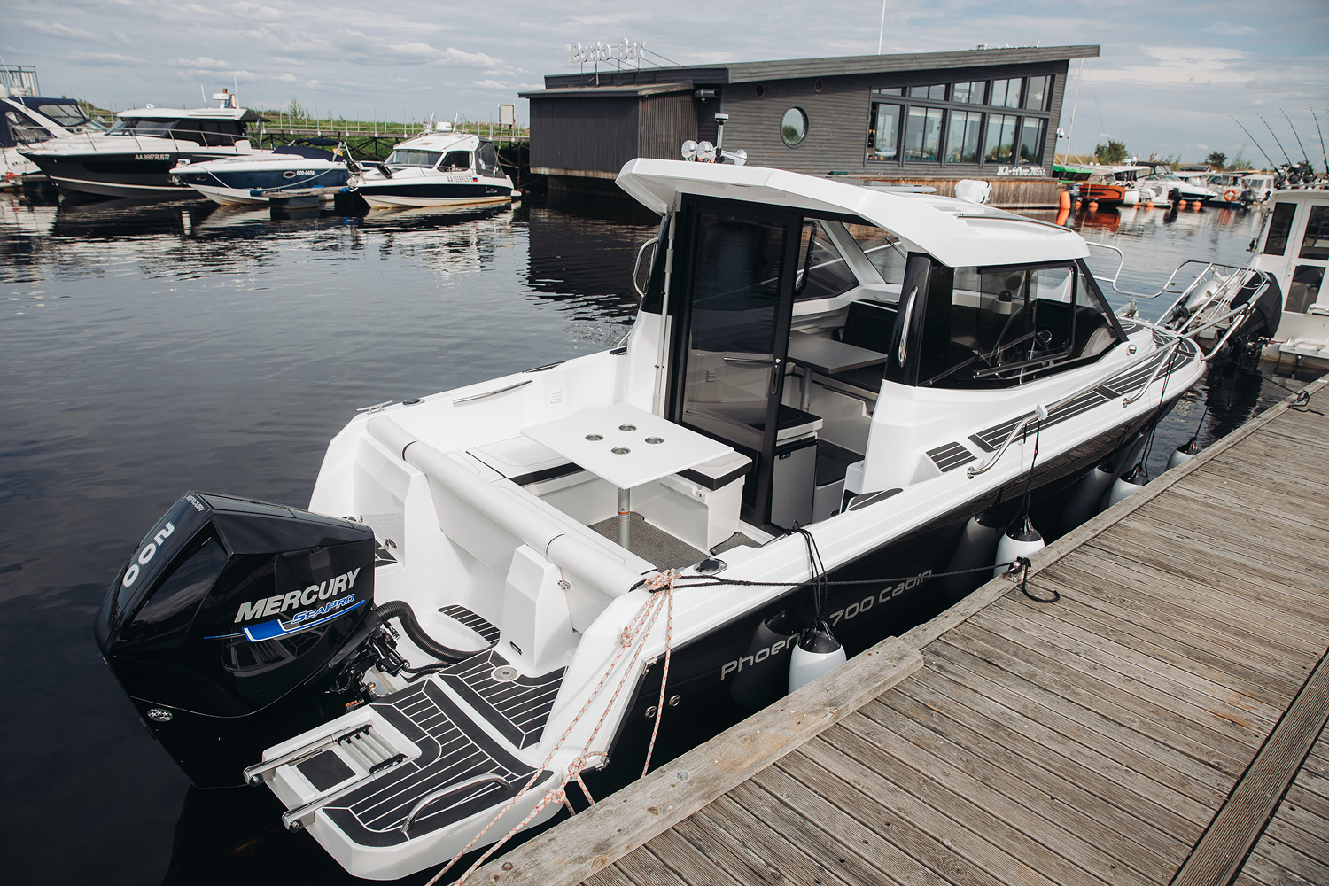 Мобильный, элегантный, многоцелевой катер Phoenix 700 Cabin, идеально подходит для водных прогулок в кругу семьи. Он обладает отличными мореходными качествами. Благодаря продуманной планировке внутри, в нем комфортно могут разместиться на ночлег 4 человека. Просторный кокпит оборудован Г-образным диваном, который раскладывается в комфортный лежак. Посредине размещён широкий обеденный стол. Гальюн и камбуз, оборудованный мойкой позволяет катеру быть полностью автономным и подходит для дальних путешествий с ночёвками.
